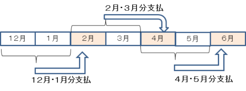 年金の支払いは、次のとおり、前2か月分を偶数月の15日に後払いする形で行われています。